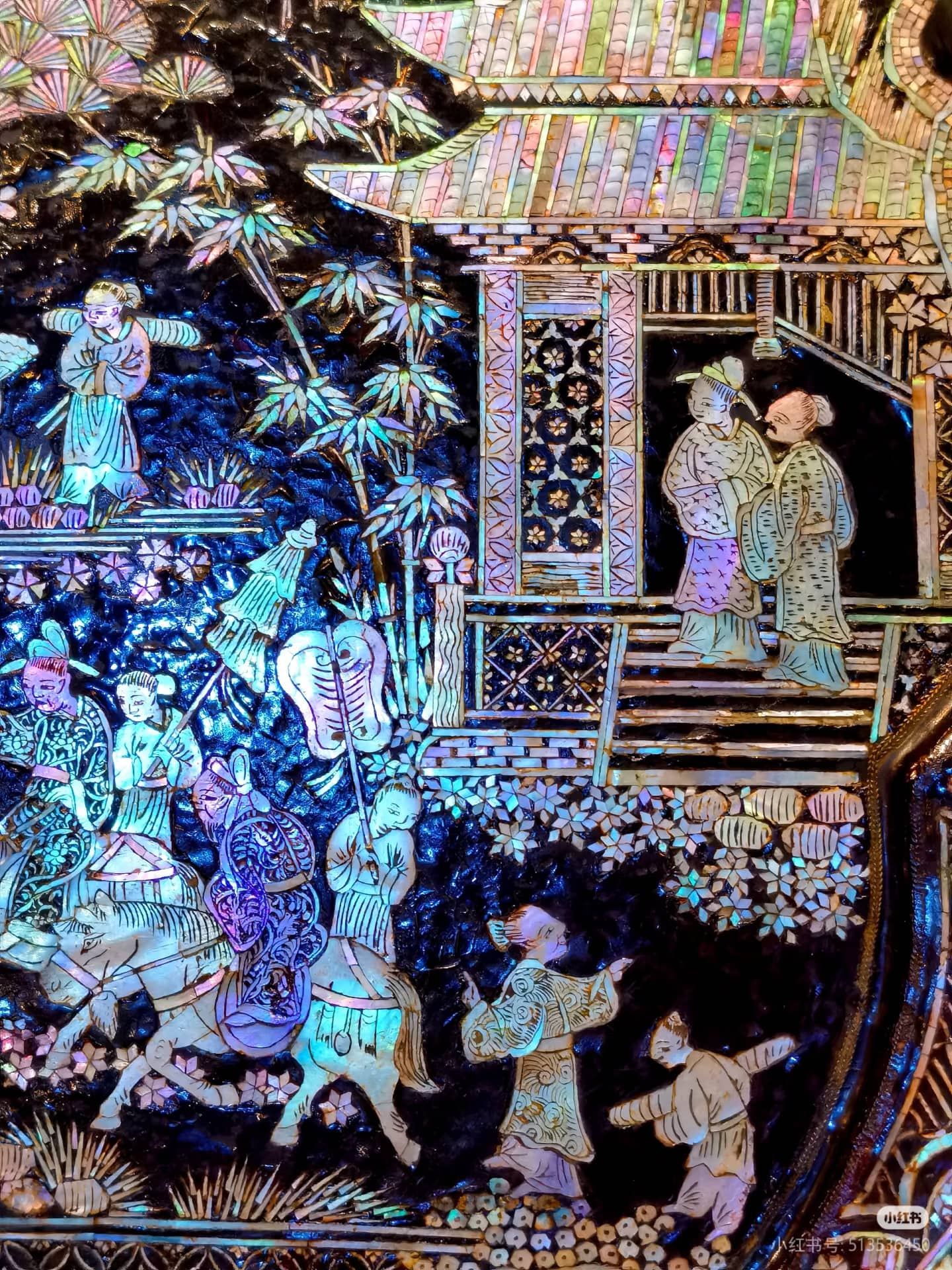 工匠将螺贝锯磨成片拼贴成花鸟、人物等丰富图案,钿片晶莹,光彩夺目