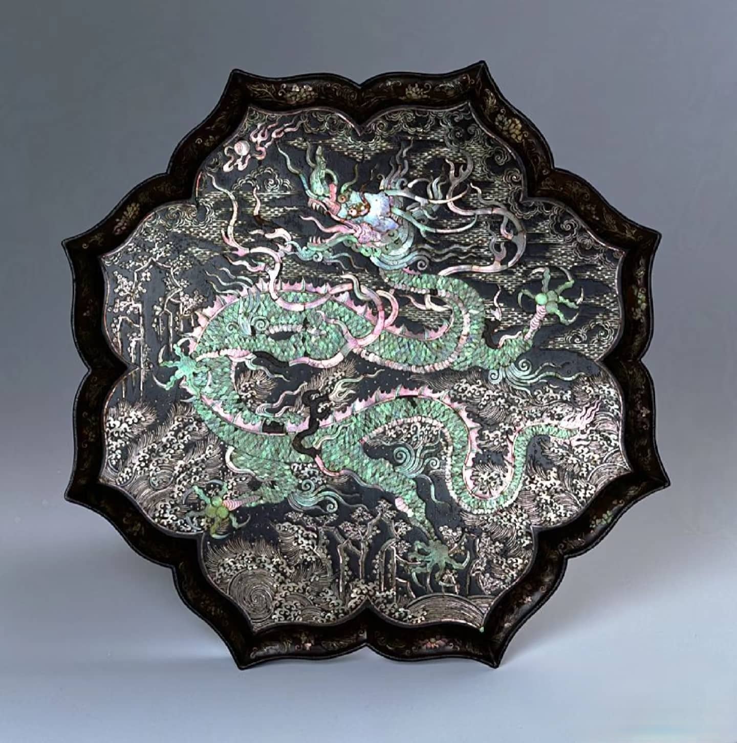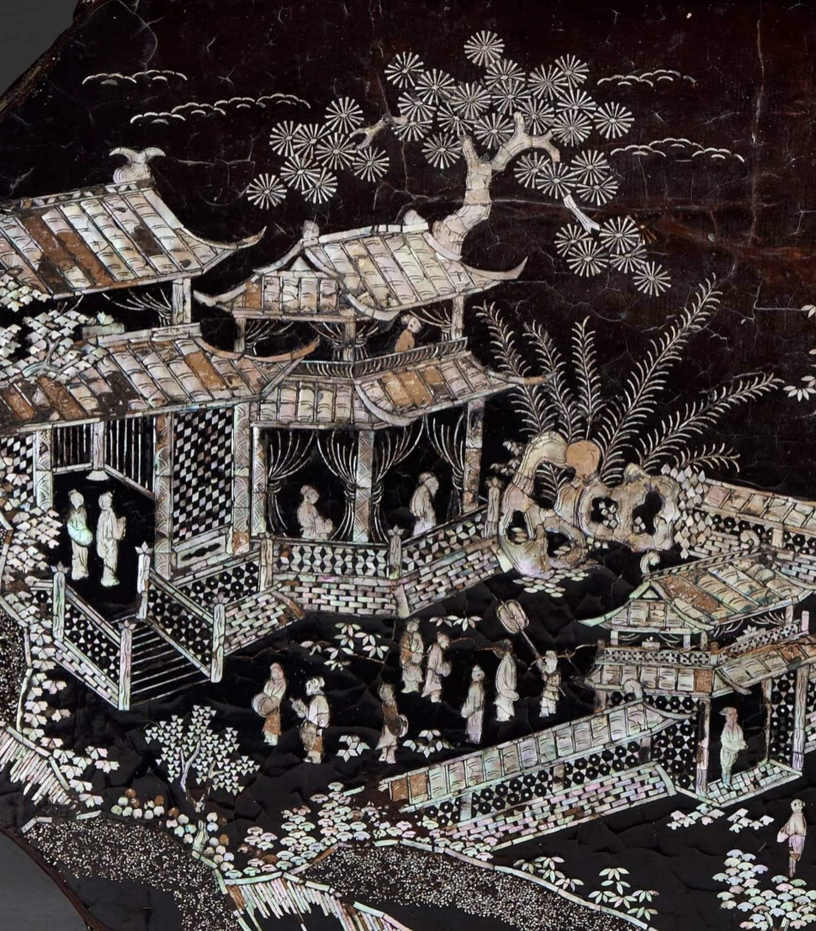 清代初期螺钿工艺深受宫廷喜爱,点螺工艺尤为精巧,用彩色鲍鱼贝壳切成细片镶嵌,光泽绚烂