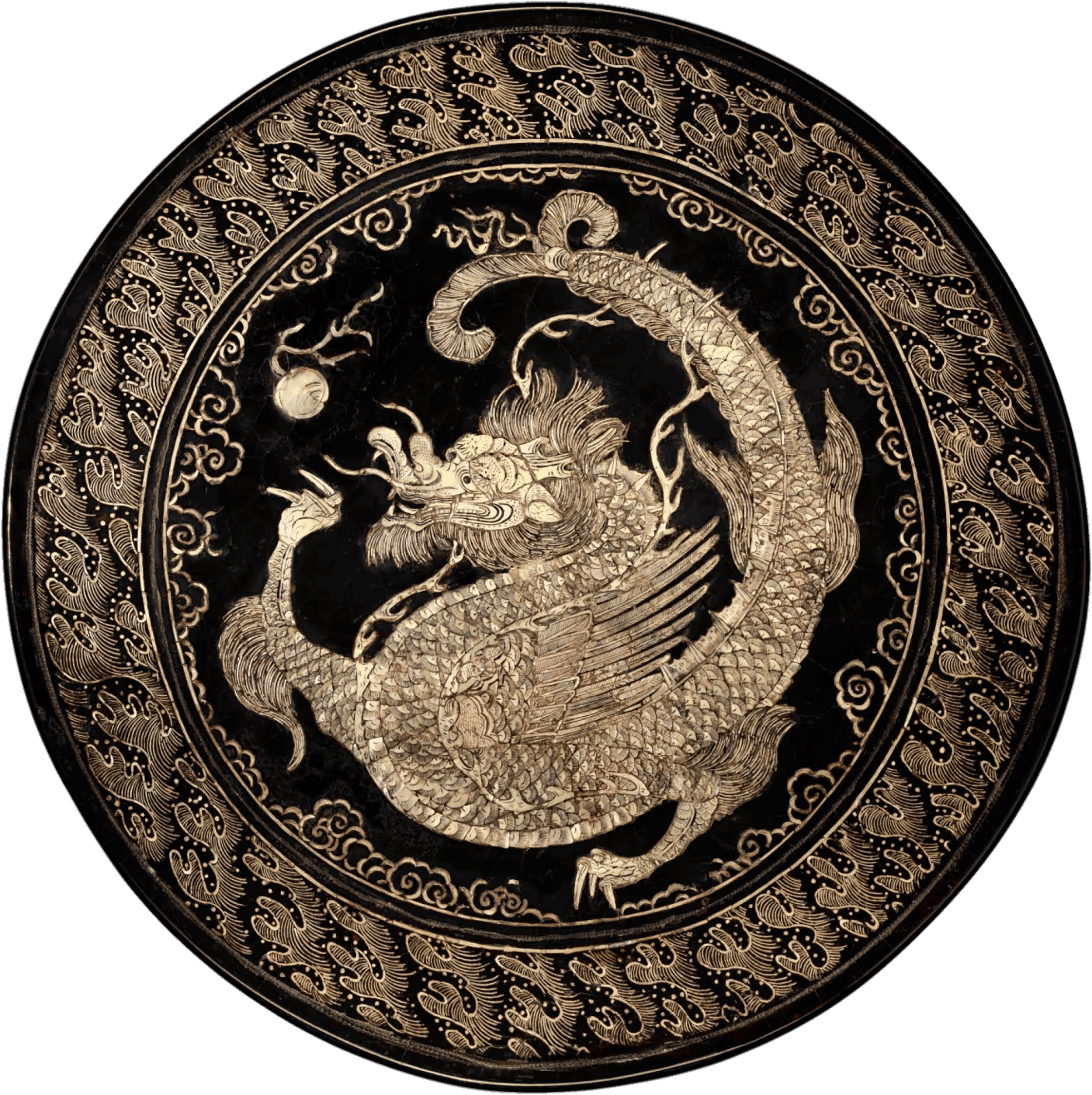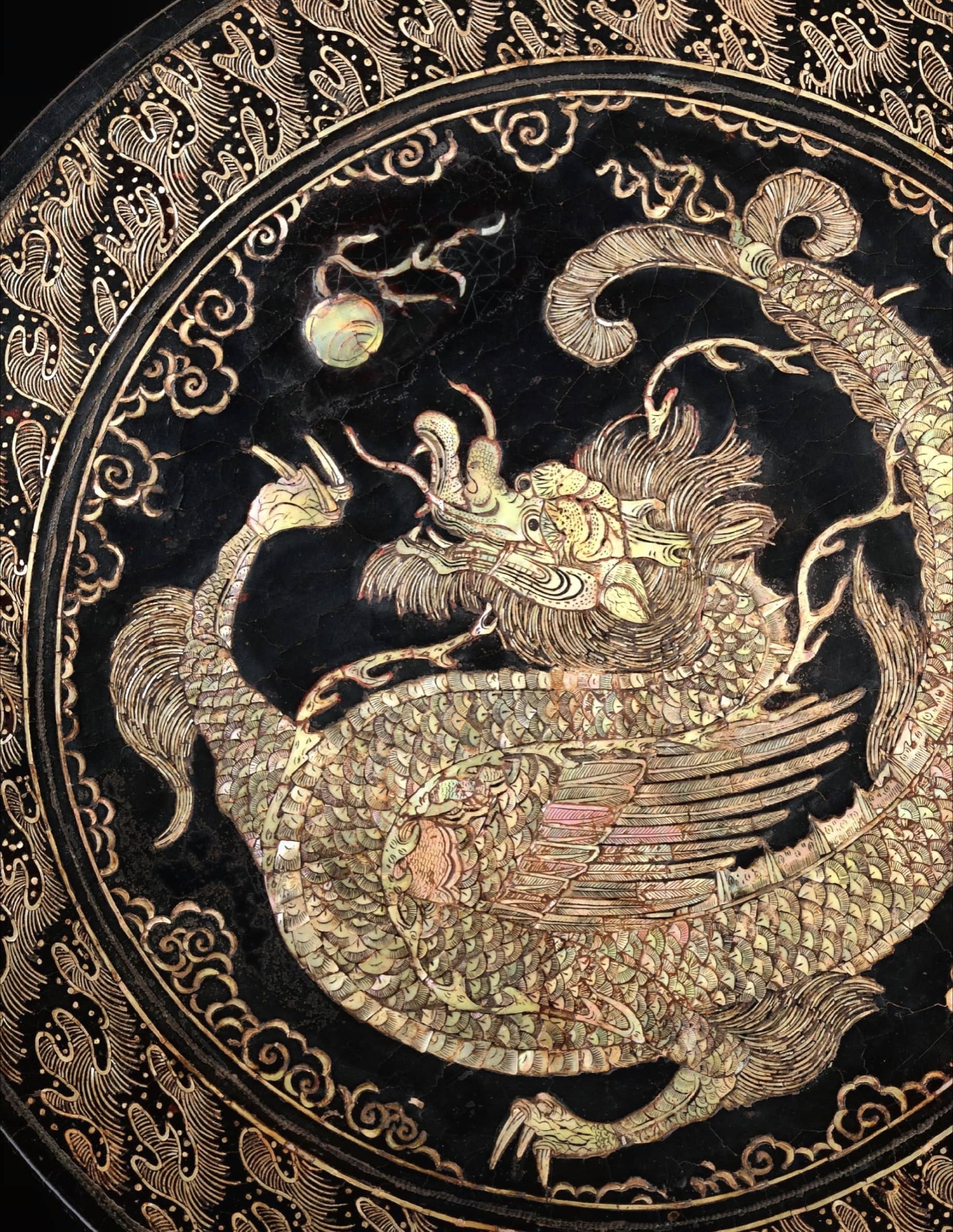 元大都遗址发现的广寒宫图薄螺钿黑漆盘残片,运用分裁壳色、随彩而施的技法,展现出元代薄螺钿工艺的成熟,虽文献记载较少,但实物印证了其工艺突破。